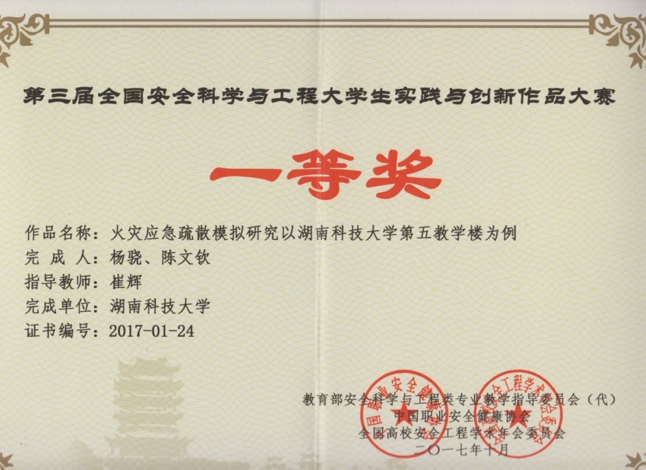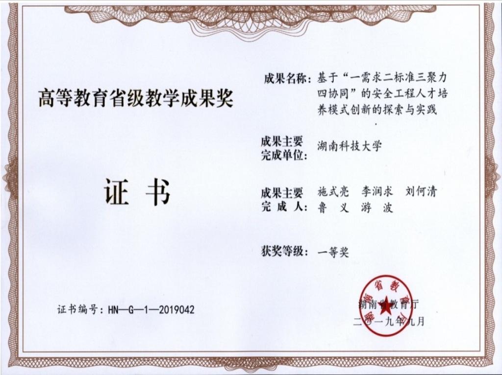 安全工程专业以服务需求核心理念指导人才培养,学生培养与就业创业由矿山安全单一模式转化为矿山安全、建筑安全、工业安全、公共安全、职业健康等融合模式。近几年,安全工程专业研究生考取率超过20%,一次就业率达到98%;荣获全国安全科学与工程大学生实践与创新作品大赛一等奖3项,探知未来全国青年科普创新实验暨作品大赛优胜奖,第十届“节能减排”湖南科技大学大学生社会实践与科技竞赛特等奖,在各类科技竞赛中130余人次获奖;主持国家级大学生创新创业训练计划项目、湖南科技大学“卓越学子计划”项目、湖南科技大学SRIP重点项目等竞赛项目40余项,发表“三高”等高水平学术论文与授权发明专利数也逐年增加。