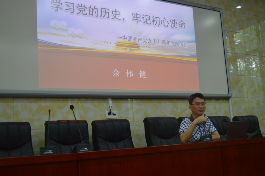 余伟健书记首先肯定了学习党史的必要性和深远性。他表示,通过学习党史,能增强我们对党的感情认同,理论认同,政治认同,这对继承和发扬光荣革命传统、党的优良作风,对提高自身认识和处理实际问题的能力都是十分必要和有益的。接着,余书记从陈独秀、李大钊等人创立共产党的思想萌芽出发,阐述了我党从成立至今的历史发展脉络。从1921年的第一次全国代表大会到2017年的第十九次全国代表大会,党的发展也由曲折试探变为勇往直前,做到了从站起来到富起来到强起来,全面开启了中华民族伟大复兴的新时代。