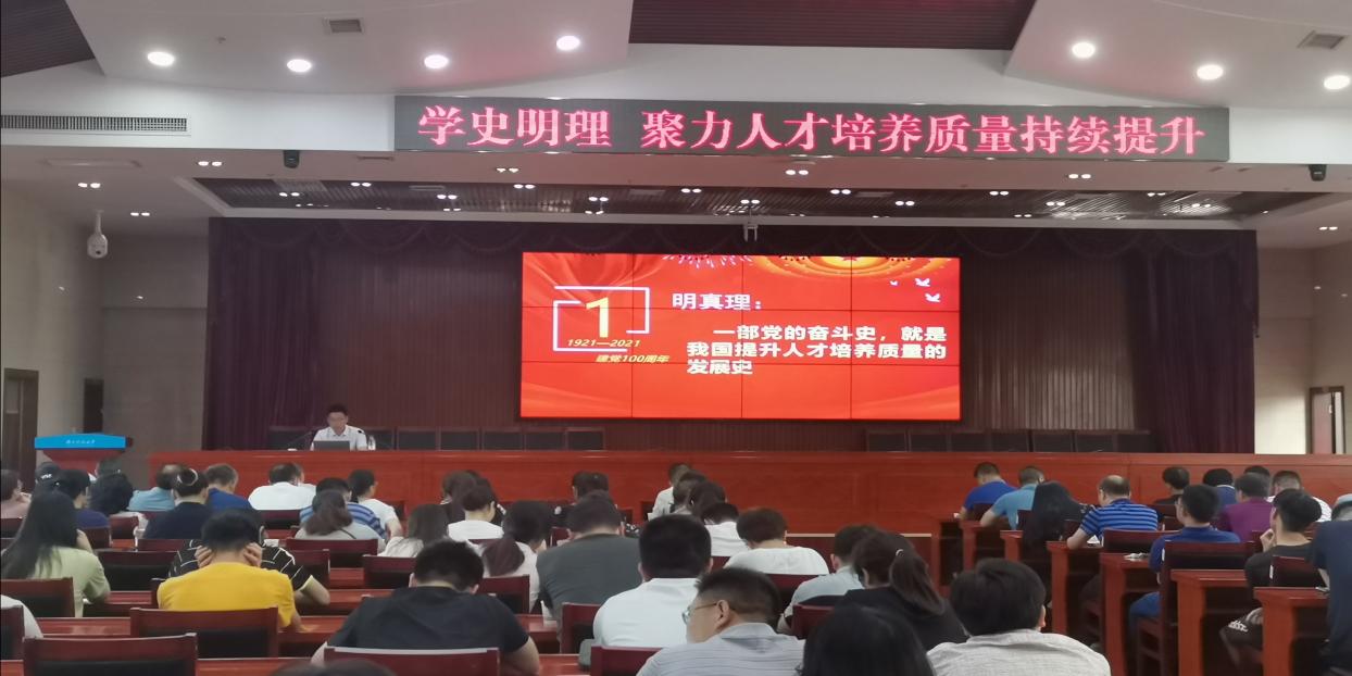 2021年6月22日下午16:30,校党委委员周智华在立德楼五楼报告厅讲授“学史明理,聚力人才培养质量持续提升”专题党课,学校相关部门与足球论坛 各党支部党员与会。