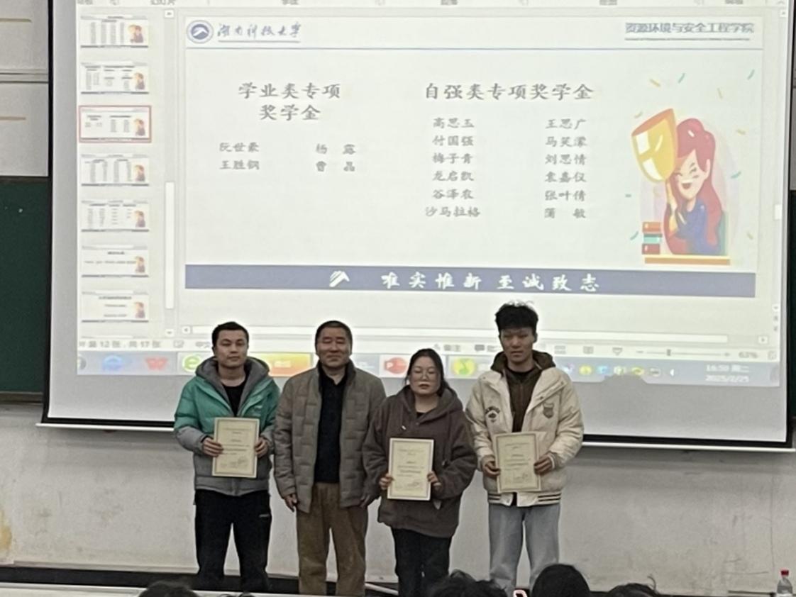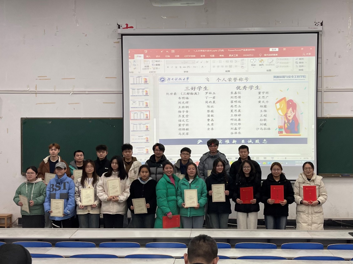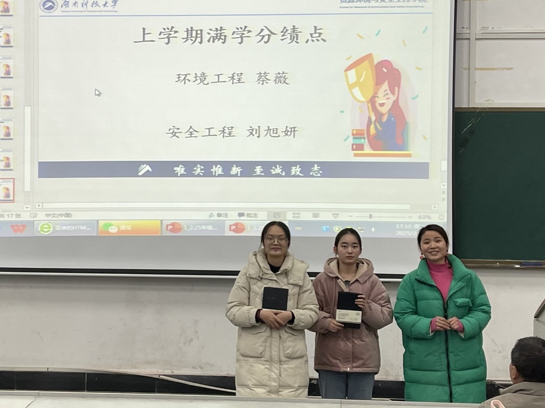 两位辅导员老师为获奖同学颁发证书并合照,阮世豪、王胜钢等120名同学获得学校奖学金,韦明福、阮世豪等61名同学获得三好学生等荣誉称号。此外,表扬了彭帅等5名获得进步奖的同学,以及蔡薇、刘旭妍两位上学期满学分绩点的同学,希望受表彰的同学能够珍惜荣誉、戒骄戒躁、积极进取,充分发挥模范带头作用,在今后的学习和生活中再创佳绩。