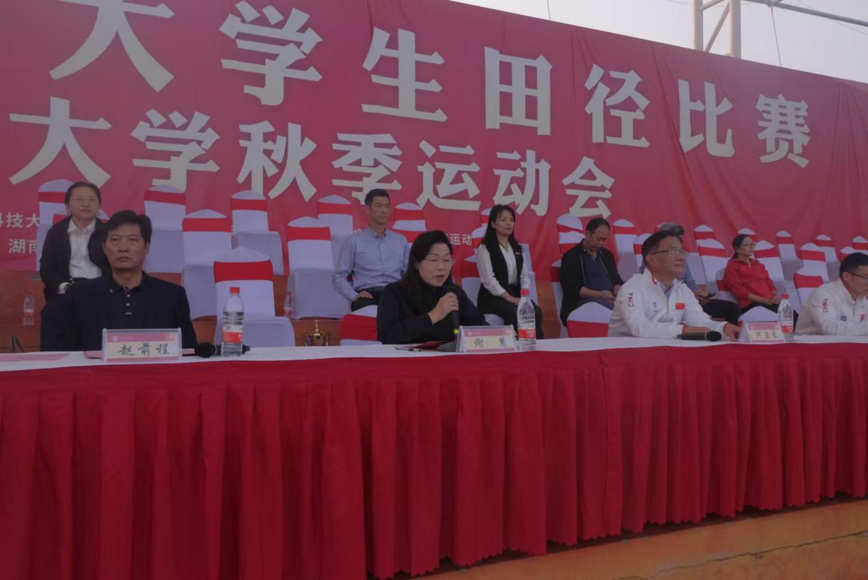 每一个奖项都凝聚着运动员们的辛勤付出和团队间的默契配合,他们用自己的汗水和努力诠释了什么是真正的体育精神。最后,湖南科技大学党委副书记谢慧发表了热情洋溢的致辞。她充分肯定了本次运动会的成功举办以及全体师生展现出的良好精神风貌。她指出,这次运动会不仅是对同学们身体素质和精神风貌的一次检阅,也是对学校组织能力、管理水平的一次考验。