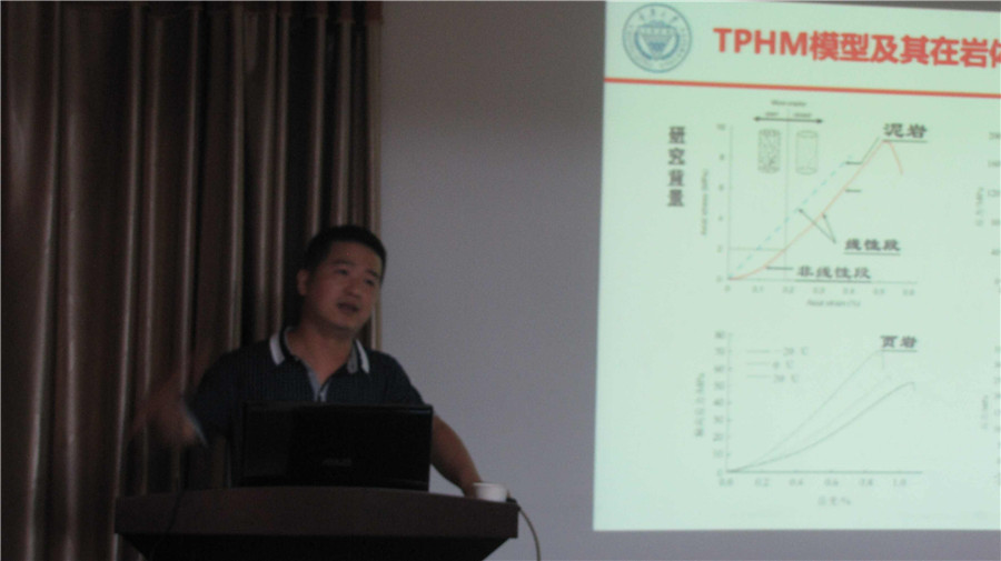 赵瑜教授首先介绍了重庆大学岩石力学相关的教学、科研力量,科研成果的情况,结合自己已经完成的“TPHM模型及其在岩体工程中的应用研究”,进行了详细讲解和分析,围绕岩石力学、计算力学及工程地质方面的研究工作与与会人员进行了深入的交流。