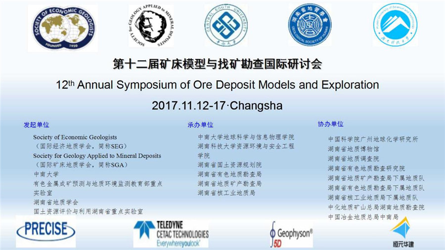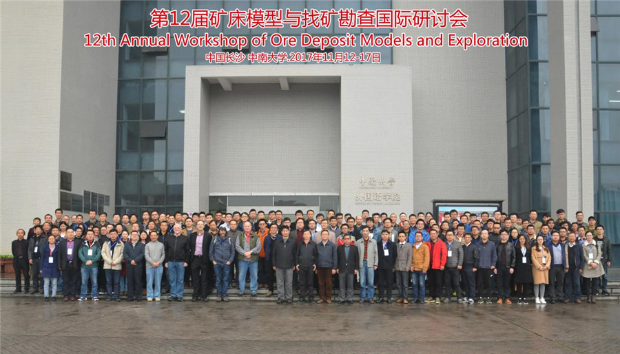 2017年11月12-17日,第十二届矿床模型与找矿勘查国际研讨会在长沙中南大学新校区外国语楼成功召开。本次会议由国际经济地质学会(SEG)、国际矿床地质学会(SGA)、中南大学和湖南省地质学会等单位共同发起,由中南大学地球科学与信息物理足球论坛 、足球论坛-足球推荐论坛 、湖南省国土资源规划院和湖南省有色地质勘查局等多家单位承办,中国科足球论坛 广州地球化学研究所、湖南省地质科学研究院等单位协办。会议就造山型金矿床、矽卡岩矿床、岩浆铜镍硫化物矿床、钨锡矿床、斑岩矿床、VMS和MVT等不同类型矿床的大地构造背景、区域成矿条件,矿床地质特征、矿床成因以及找矿勘查等内容进行研讨。