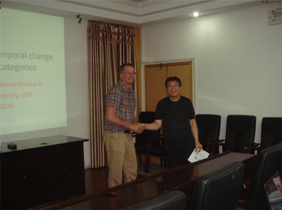 Pontius教授所在的克拉克大学是美国大学地理学排名前七位、地理信息科学排名前五的大学,也是美国大学地理学博士培养人数最多的大学,该校在土地利用变化研究领域的成果让人注目。Pontius教授是国际学术界土地利用变化学领域的重要角色,他在土地利用变化强度计算及地图比较精度测算方面做出原创性贡献,论文发表在《International Journal of Geographical Information Science》等杂志上。他目前已经培养了博士毕业5名,硕士生毕业的有60名,学生中约有20%为中国人。他的主要研究领域为土地利用时空变化及预测、遥感解译误差分析,他尤其善于运用应用数学的方法与思维来解决GIS、遥感中存在的一些难题,特别是开发了土地变化模拟模型,并采用定量方法来反映土地变化的特征。其中的一些方法已经集成到他参与开发的Idrisi软件中,这一GIS软件由克拉克大学开发,目前在全世界已经有多于十万人在使用。本次讲座,Pontius教授围绕土地变化学的Intensity analysis、Transition frequency、Cross-tabulation、GEOMOD model、Mean Absolute Deviation等核心概念,系统介绍了他的研究团队在土地利用变化领域的前沿思想和交叉成果,详细阐述了强度指数模型、地图定量比较方法、GEOMOD模拟与精度等的应用和理论思考。讲座内容安排合理,理论与案例相结合,数理方法与地理思想相结合,深入浅出,互动性强,取得了良好的效果,受到了与会师生的热烈欢迎和一致好评。