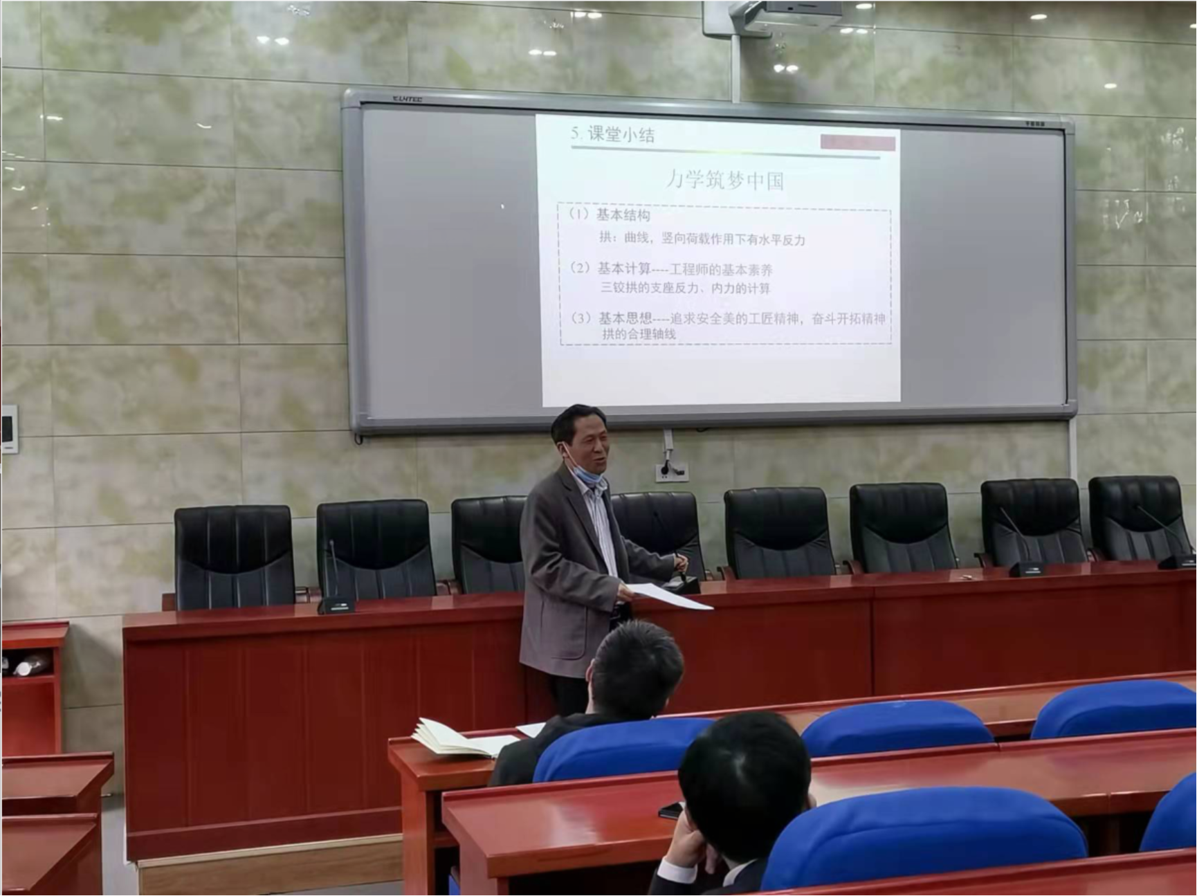 在本次竞赛中,采矿系袁志刚副教授以“拱的受力特点”“三铰拱的支座反力、内力计算”“三铰拱的合理轴线”为内容,结合案例分析,将社会主义核心价值观、科学精神、工匠精神和家国情怀融入专业课程教学中,实现了课程思政和专业知识讲授的无缝衔接。