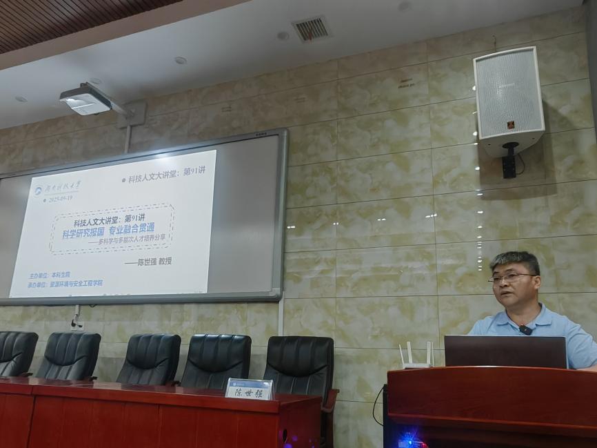 陈世强教授,湖南科技大学“湘江学者”人才,主要从事地下空间通风空调、空气净化与装备节能方面的研究。讲座伊始,陈世强教授以“人才培养概述”为切入点,聚焦多学科与多层次人才培养的核心要义,他结合当前科技发展趋势指出,新时代对人才的需求已从“单一专业精通”转向“跨领域融合创新”,强调打破学科壁垒、构建贯通式培养体系的重要性,为在场师生厘清了多维度人才培养的方向与路径。随后,陈教授分享了自己在科研领域的发展历程,讲述了自己在专业领域深耕的历程,并详细介绍了当前的研究重点与阶段性成果,为青年学子提供了可借鉴的成长范本。讲座的核心部分,陈世强教授以“科学研究报国”为主题,传递深厚家国情怀,他结合我国科技发展的关键节点,分享了科研工作者应该如何将个人研究与国家需求紧密结合,用实际成果助力行业发展、服务社会进步。
