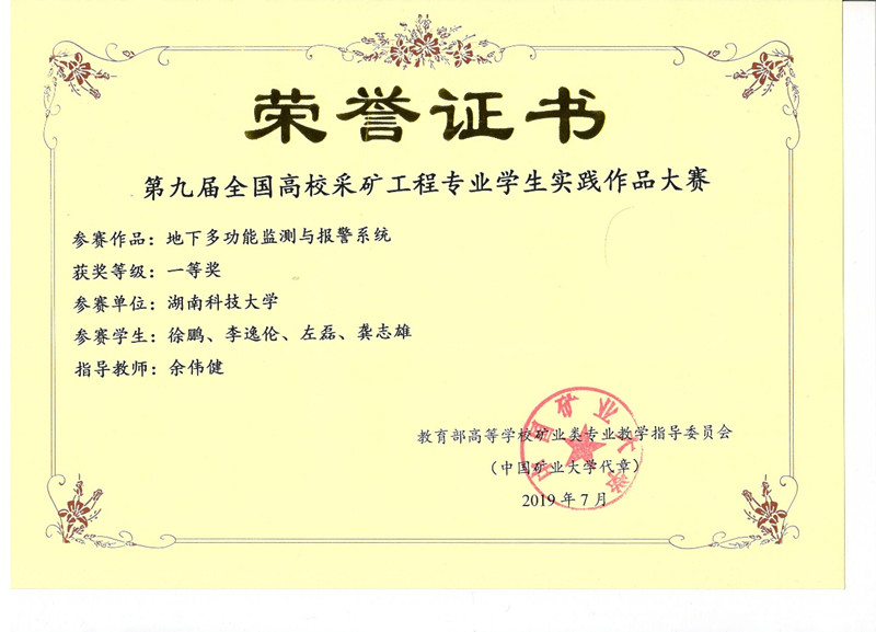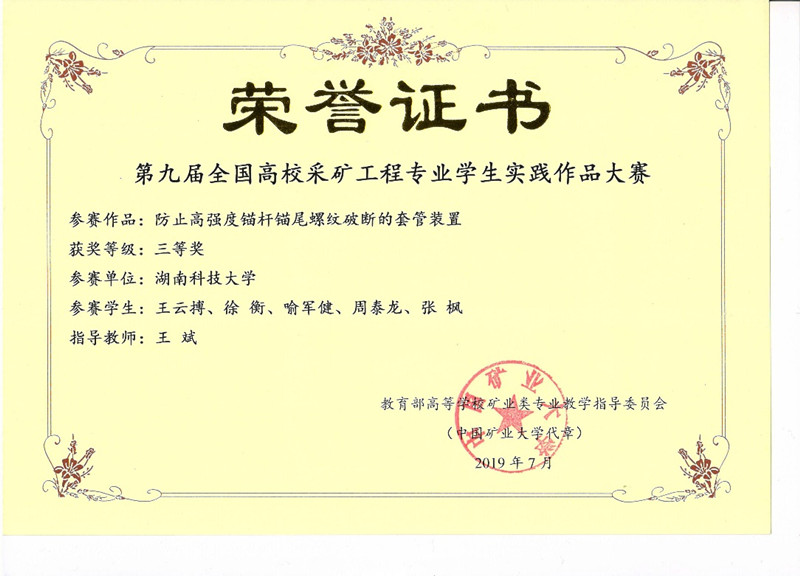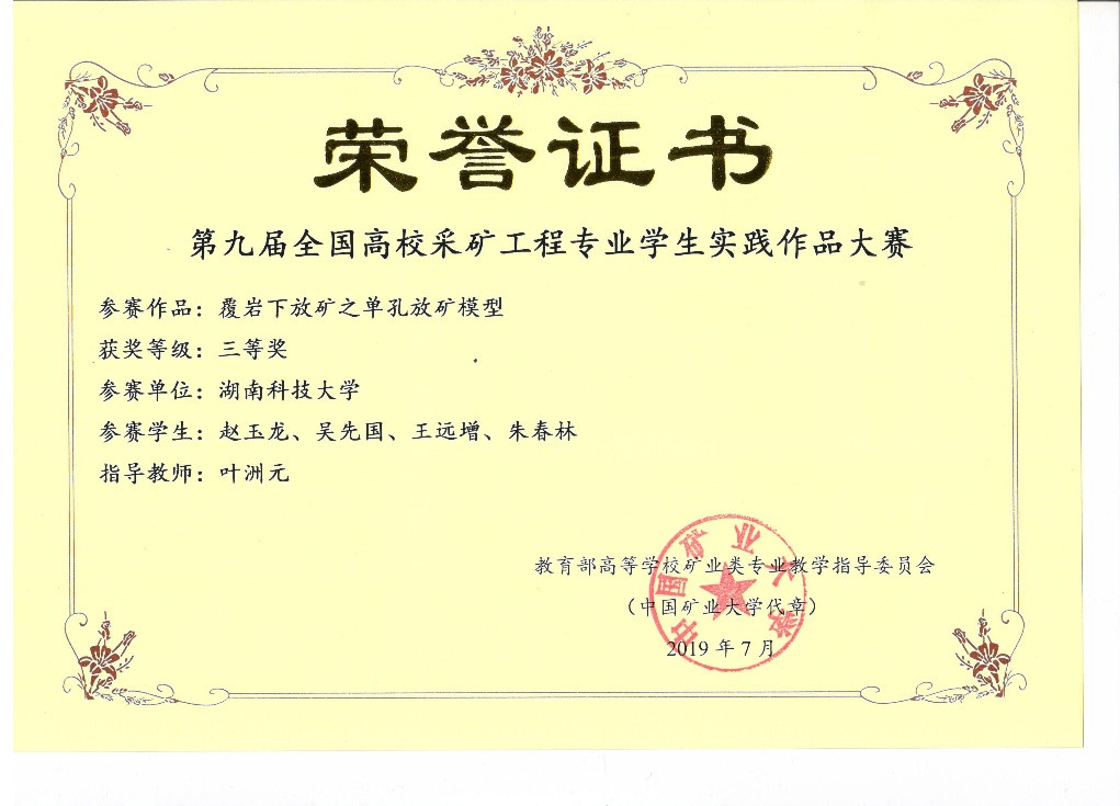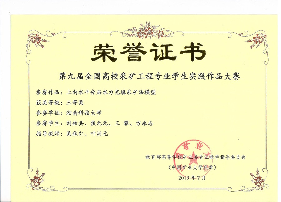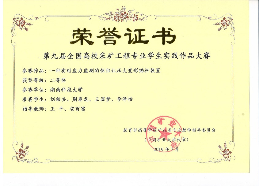 2019年7月18-22日,第33届全国高校采矿工程专业年会暨第九届全国高等学校采矿工程专业学生实践作品实践大赛在辽宁科技大学举行。足球推荐论坛 采矿工程系6位教师参会,我校党委委员王卫军教授做了题为《做实三个融合,着力四个提升,培养新时代采矿工程专业人才》的大会报告。足球推荐论坛 学生获全国采矿工程专业学生实践作品大赛一等奖1项、二等奖2项、三等奖3项。其中,推送的余伟健老师指导的作品《地下多功能监测与报警系统》获得一等奖;于宪阳、张自政老师指导的《太空采矿构想模型》和王平、安百富老师指导的《一种实时应力监测的恒阻让压大变形锚杆装置》获得二等奖、叶洲元老师指导的《覆岩下放矿之单孔放矿模型》、吴秋红老师指导的《上向水平分层水力充填采矿法模型》和王斌老师指导的《防止高强度锚杆锚尾螺纹破断的套管装置》作品获得三等奖。