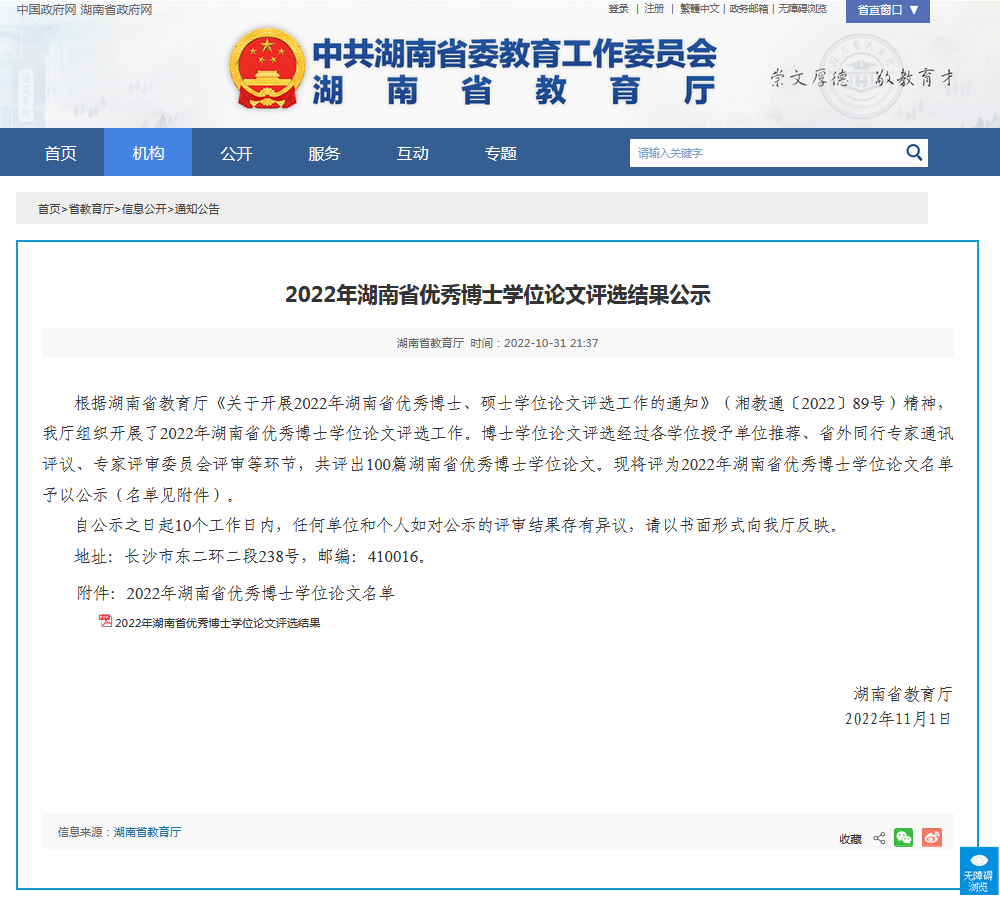 本次湖南省优秀博士学位论文的获得,是矿业工程学科近年来对博士生培养的又一重要成果。