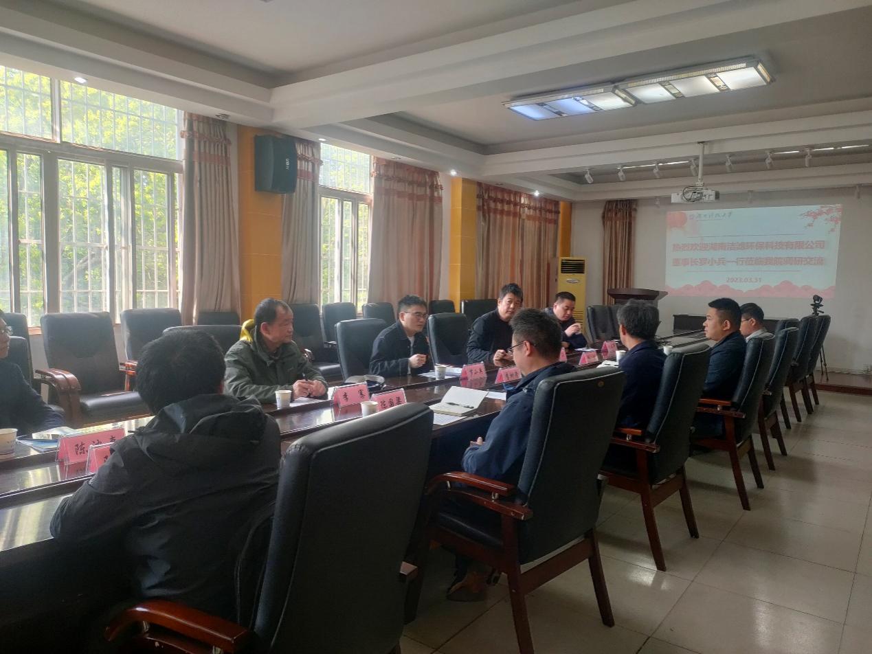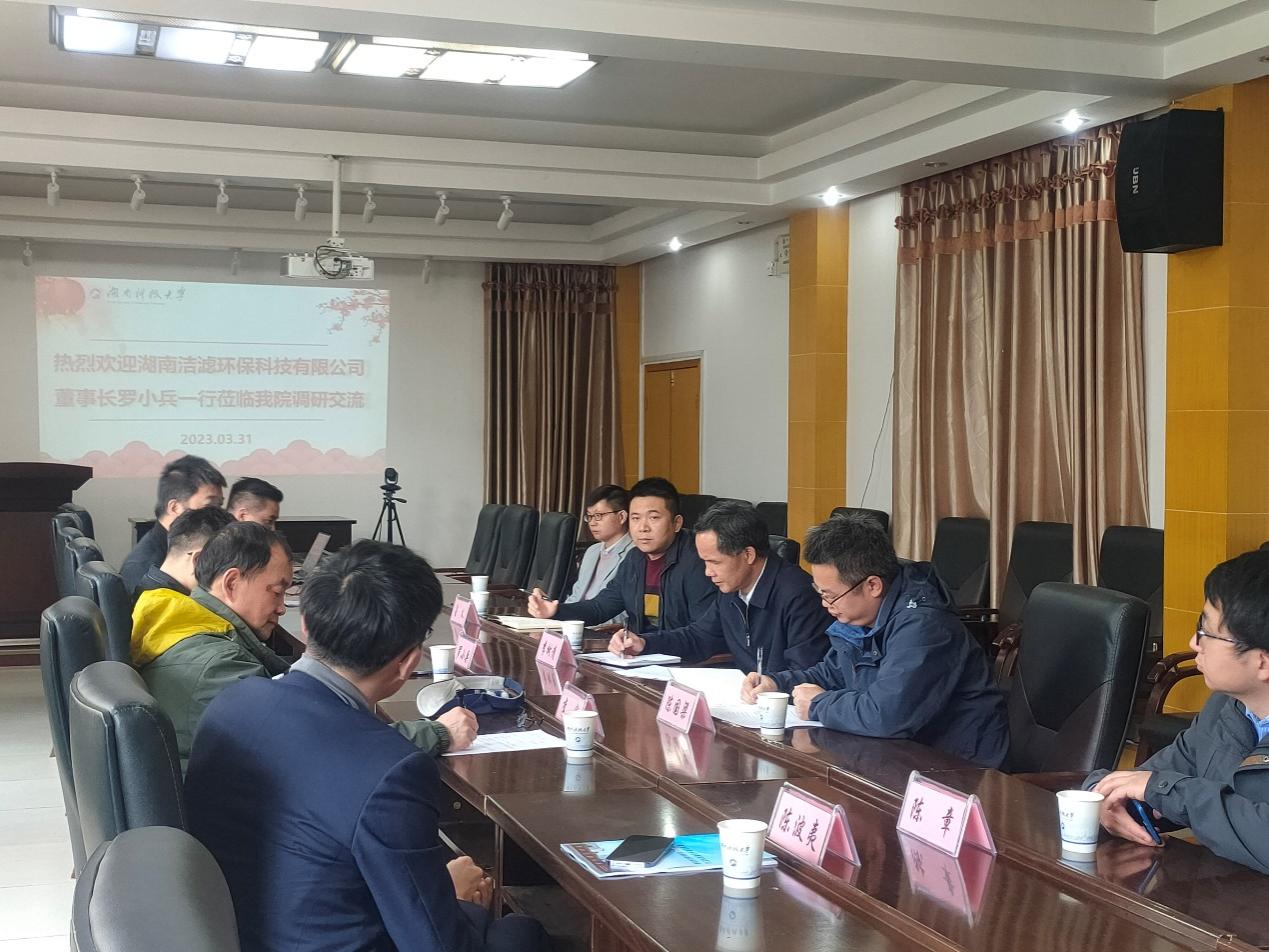 3月31日上午,湖南洁滤环保科技有限公司罗小兵董事长一行五人来足球推荐论坛 调研交流。座谈会在资安一号楼317会议室举行,足球论坛 党委书记李树清、副院长鲁义、副院长陈国梁及环境工程系教师等参加调研交流座谈会。